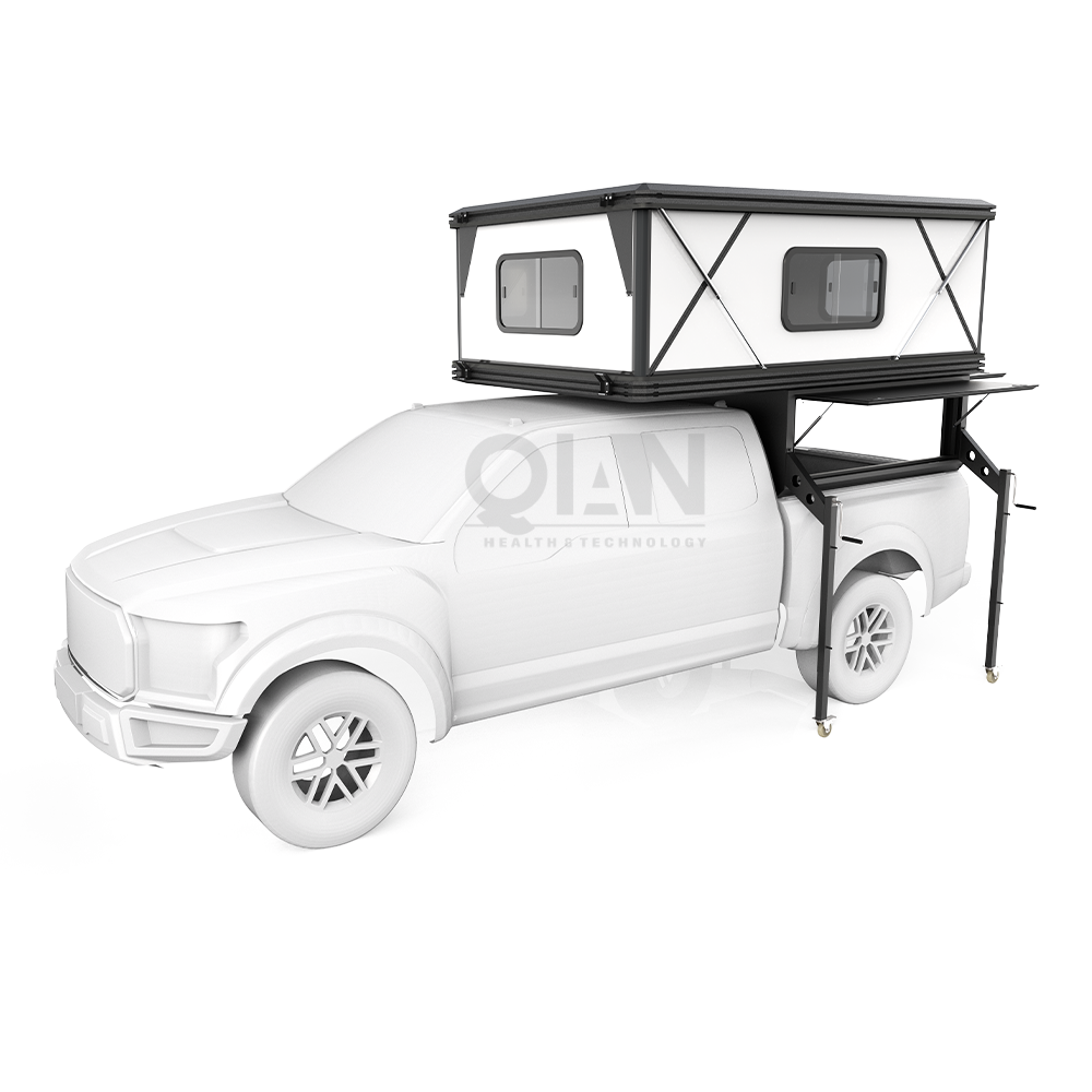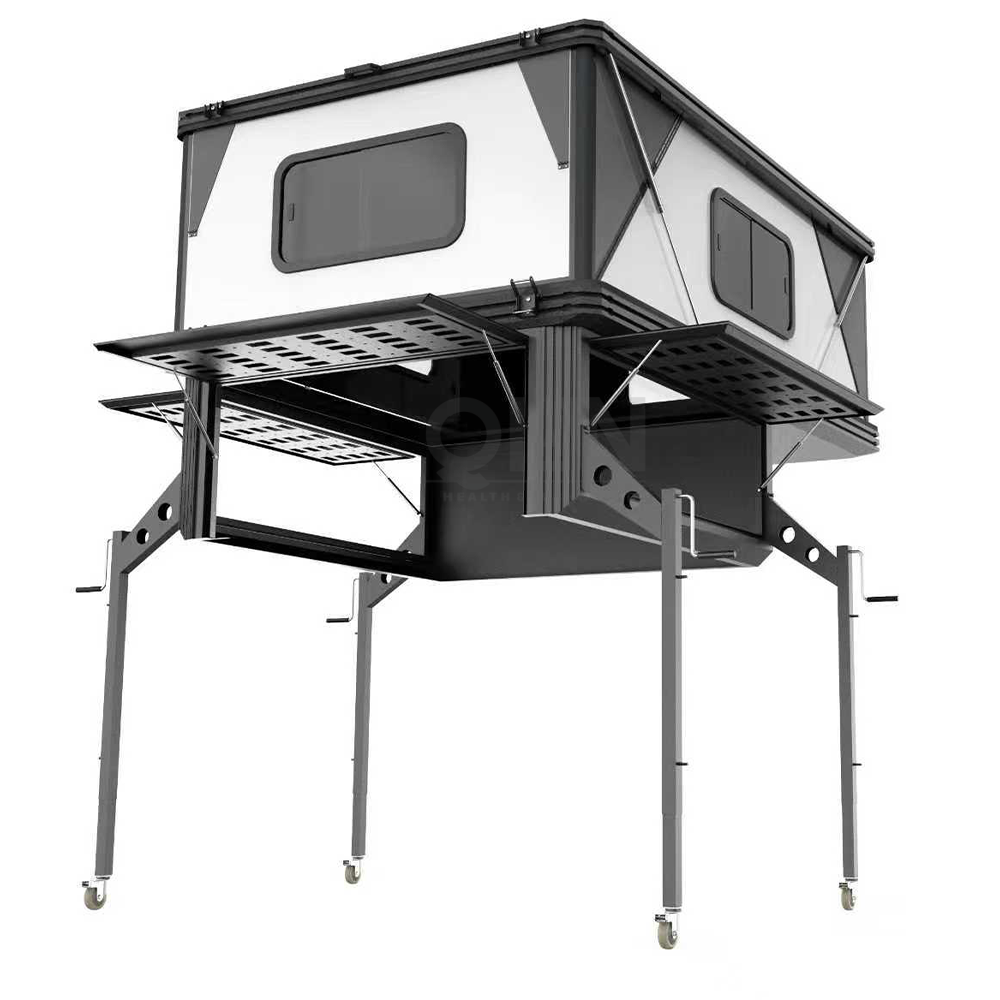–Sleeping plat forms slide to create living quarters underneath that is tall enough to stand up in